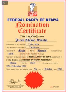 Cheti cha Jacob Themo Kwicha, cha chama cha Federal Party of Kenya kilichosababisha kukosa kuidhinishwa na IEBC