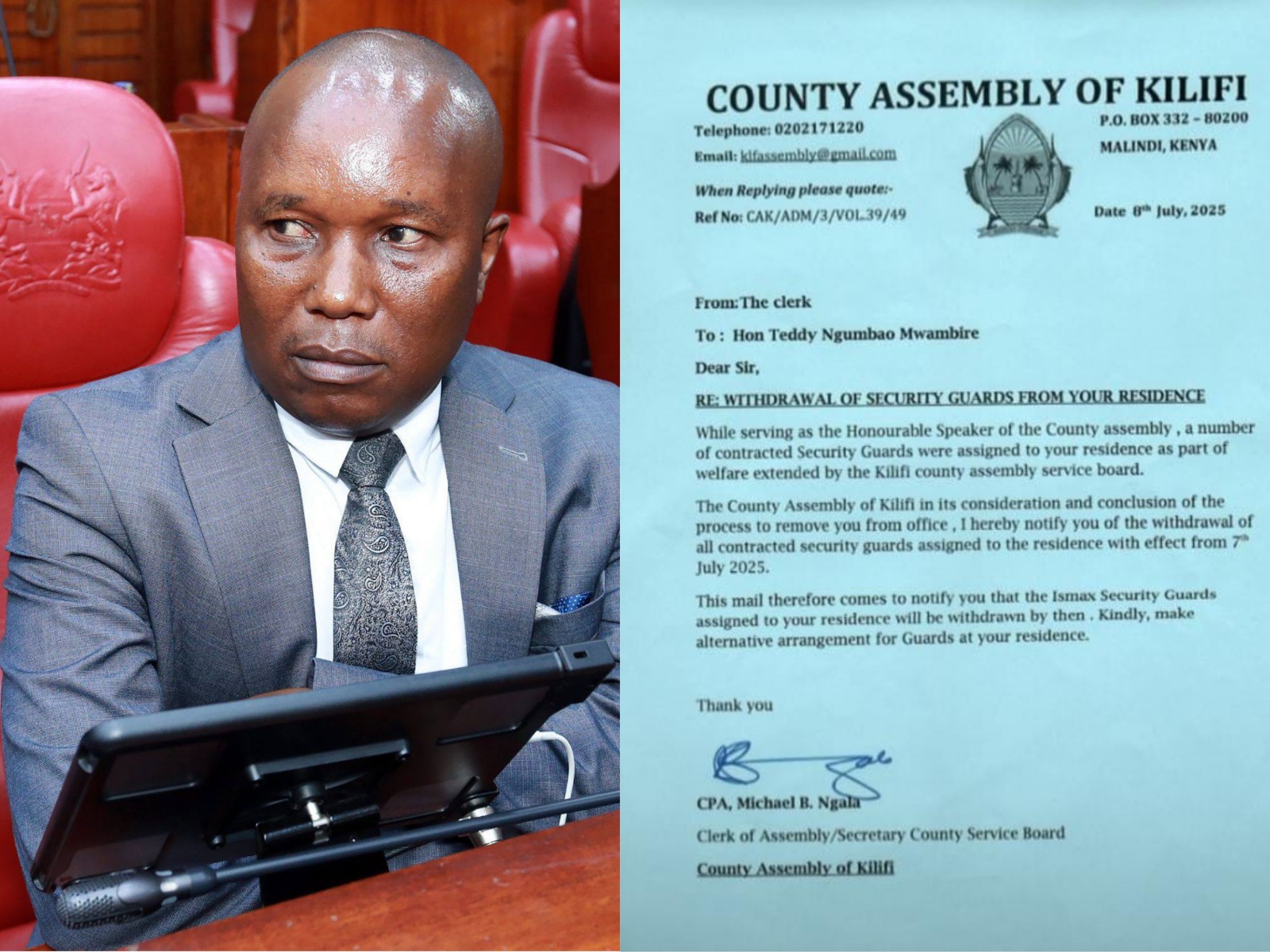 Kulingana na barua iliyoandikwa na Ngala kupitia bunge hilo na kuwasilishwa kwa Spika Mwambire, walinzi wote ambao wanalinda makaazi ya Spika huyo kupitia kampuni ya Ulinzi ya Ismax, hawatatekeleza tena majukumu yao.